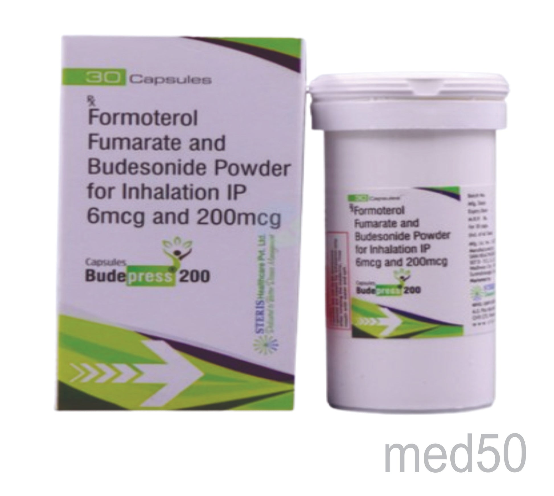 Budepress 200 Capsule is a combination dry powder inhalation formulation containing Budesonide, a corticosteroid, and Formoterol Fumarate, a long-acting β₂-adrenergic agonist (LABA).
