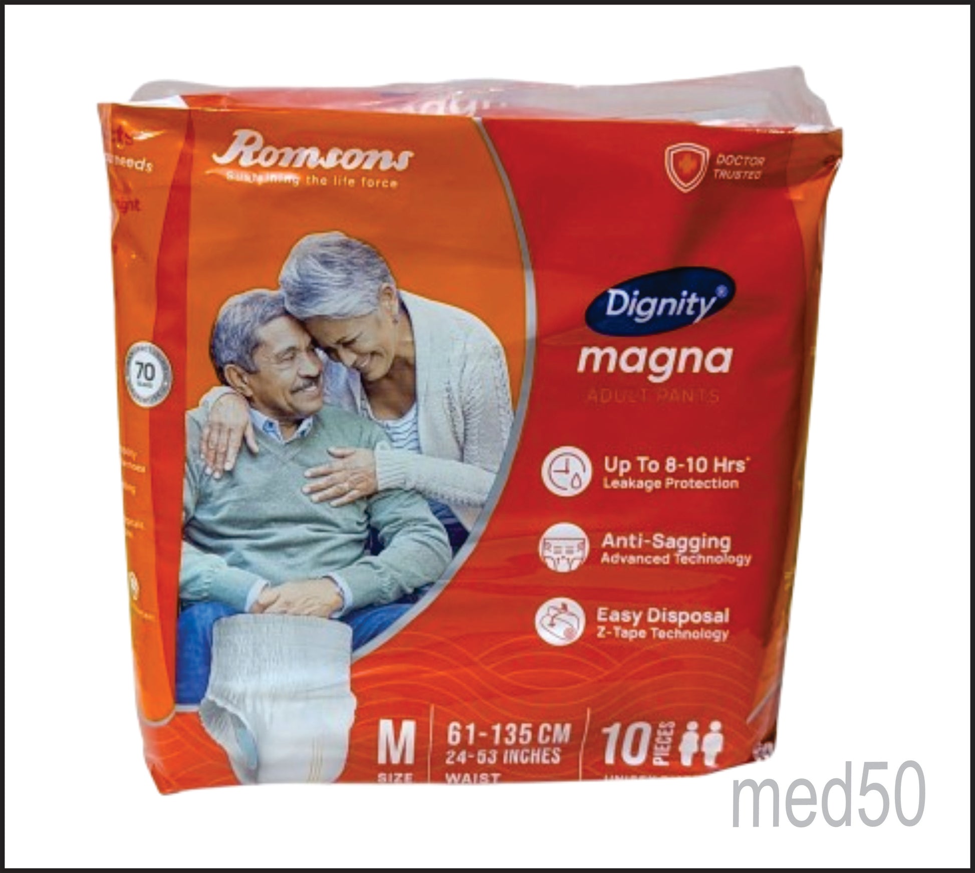 Dignity Magna Adult Pants (Medium) are disposable adult diapers designed for moderate to heavy incontinence. They offer superior absorption, comfort, and dryness with quick-lock gel technology. The pant-style design provides a snug fit, easy wearability, and enhanced mobility for day and night use.